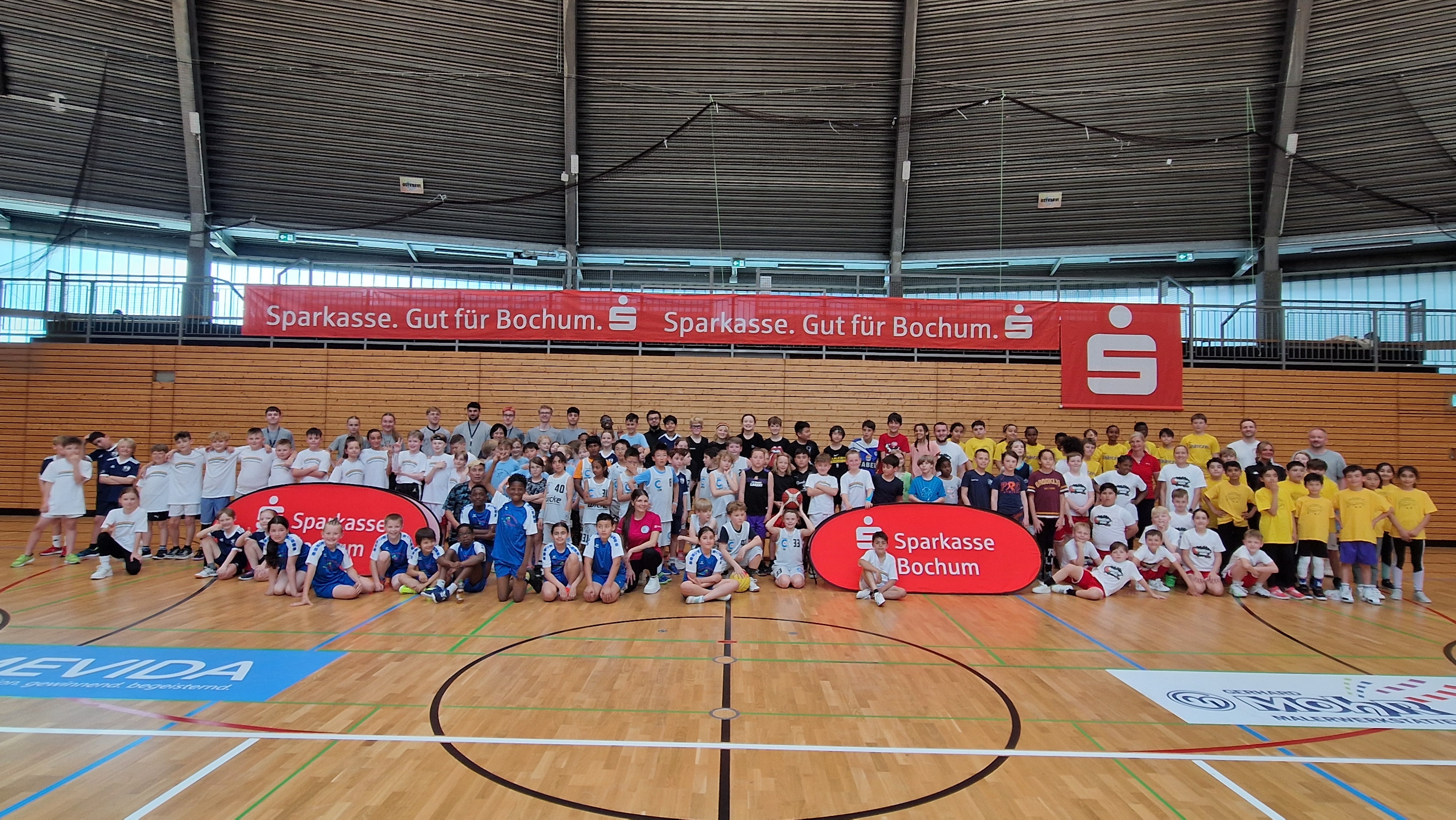 Jubel in der Bochumer Rundsporthalle: Nach überzeugenden Leistungen von der Vorrunde bis ins Endspiel steht die Regenbogenschule verdient als Siegerin des Bochumer Grundschulturniers 2024 fest. Elf Teams folgten der Einladung der VfL AstroStars Bochum, die den Wettkampf nun schon seit vielen Jahren mit Unterstützung der Sparkasse Bochum ausrichten. Zwei Schulen waren leider kurzfristig verhindert, sonst hätte man eine Rekordteilnehmerzahl erreicht. So tummelten sich am 15. Mai trotzdem über 100 Kinder auf drei Spielfeldern in der Rundsporthalle.