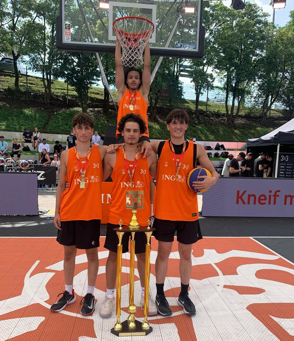 Mit fünf Siegen aus fünf Spielen und mit einem Punktedurchschnitt von 18.8 pro Spiel, konnten sich die Jungs der 3x3 Scorpions nach einem erfolgreichen Wochenende mit der Goldmedaille und der ING 3x3 Champions Trophy belohnen. Somit geht der erste Titel der 3x3 ING-Tour 2024 nach NRW.